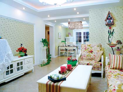 客廳的沙發(fā)是時下很流行的布藝與實(shí)木結(jié)合的款式,大花朵布藝與白色外框搭配很大氣。電視柜、鞋柜、茶幾、餐桌椅,每一件家具都是白色的,用花瓶、桌旗等飾品進(jìn)行點(diǎn)綴,顯得既整潔又不呆板。