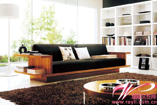 休閑區(qū)紙質(zhì)讀物收納,利用雙層擱板的長(zhǎng)條沙發(fā)